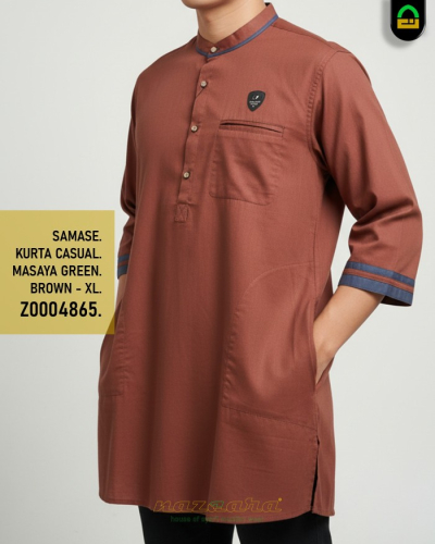 Kurta Samase bergaya casual dengan panjang lengan 3/4, dengan stripe pada lengan dan kerah. Satu saku dada dan dua kantung samping kiri kanan pinggang.