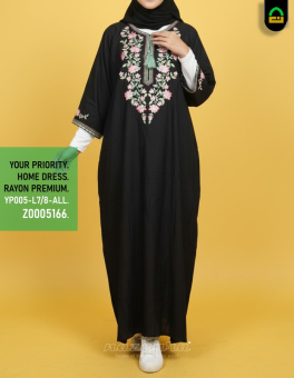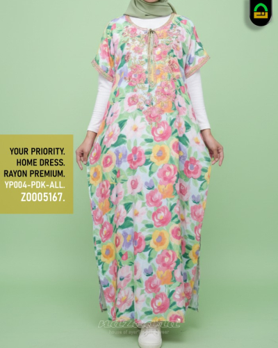 Home Dress atau Daster motif floral dengan bordir pada bagian dada sekitar resleting disertai tali kecil. Bordir juga diaplikasikan pada ujung lengan. Home dress ini memiliki lengan pendek sehingga memudahkan ukhti melakukan berbagai aktivitas pekerjaan rumah.