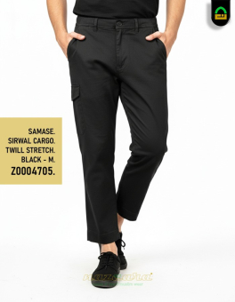 Samase Sirwal Cargo. Sirwal Cargo dengan 1 saku cargo di sebelah kanan. Pinggang elastis dengan karet. Bahan: Twill Stretch. Warna: Black.