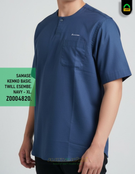 Samase Kemko Basic. Kemeja Koko Samase Basic dengan satu kancing dan satu saku dengan logo rajut di dada. Bahan: Twill Esembe. Warna: Navy.